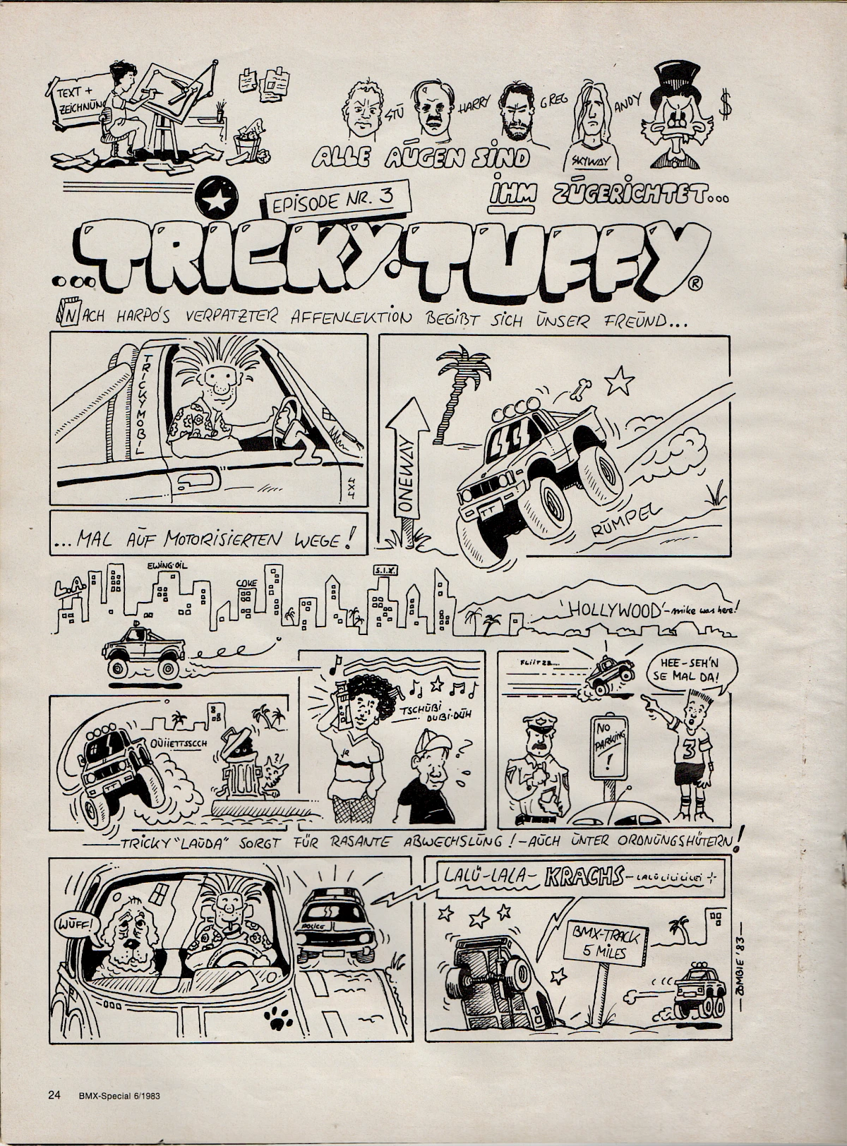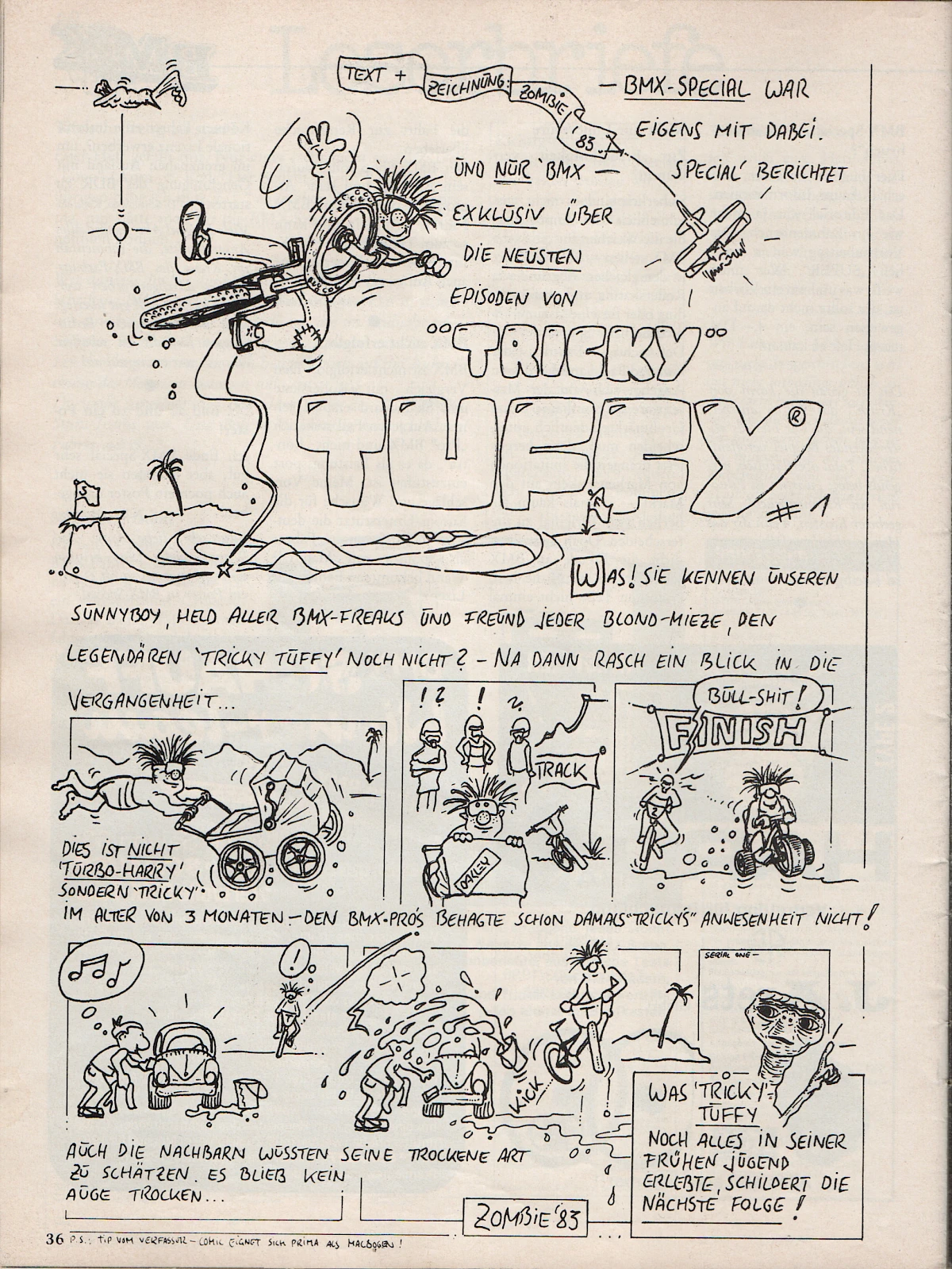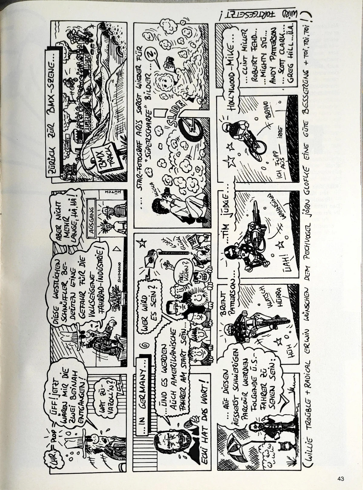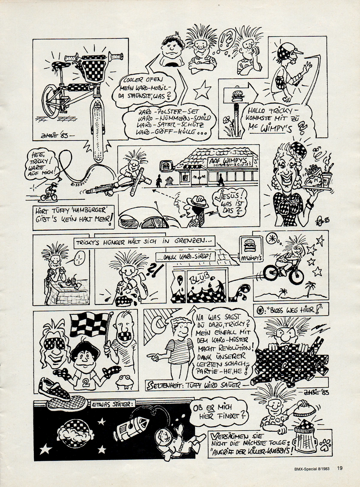 When Aris Donzelli was looking for an editorial team for the first German BMX magazine in 1982, he came across Elle and his friend Karsten Moeller with the help of Ekkehardt Teichreber, who from then on ran the Berlin "office" of BMX Special Magazine from their childhood bedrooms together with photographer Uli Aust (RIP). With his editorial contributions, his expertise and not least his comics, Elle enriched the magazine from the very beginning. The works of "Zombie", "Duke", "El Duke" and later "Elle" are etched in the collective memory of Germany's first BMX generation, just like the Instant Funk adverts or his contributions to "American Sports" magazine.