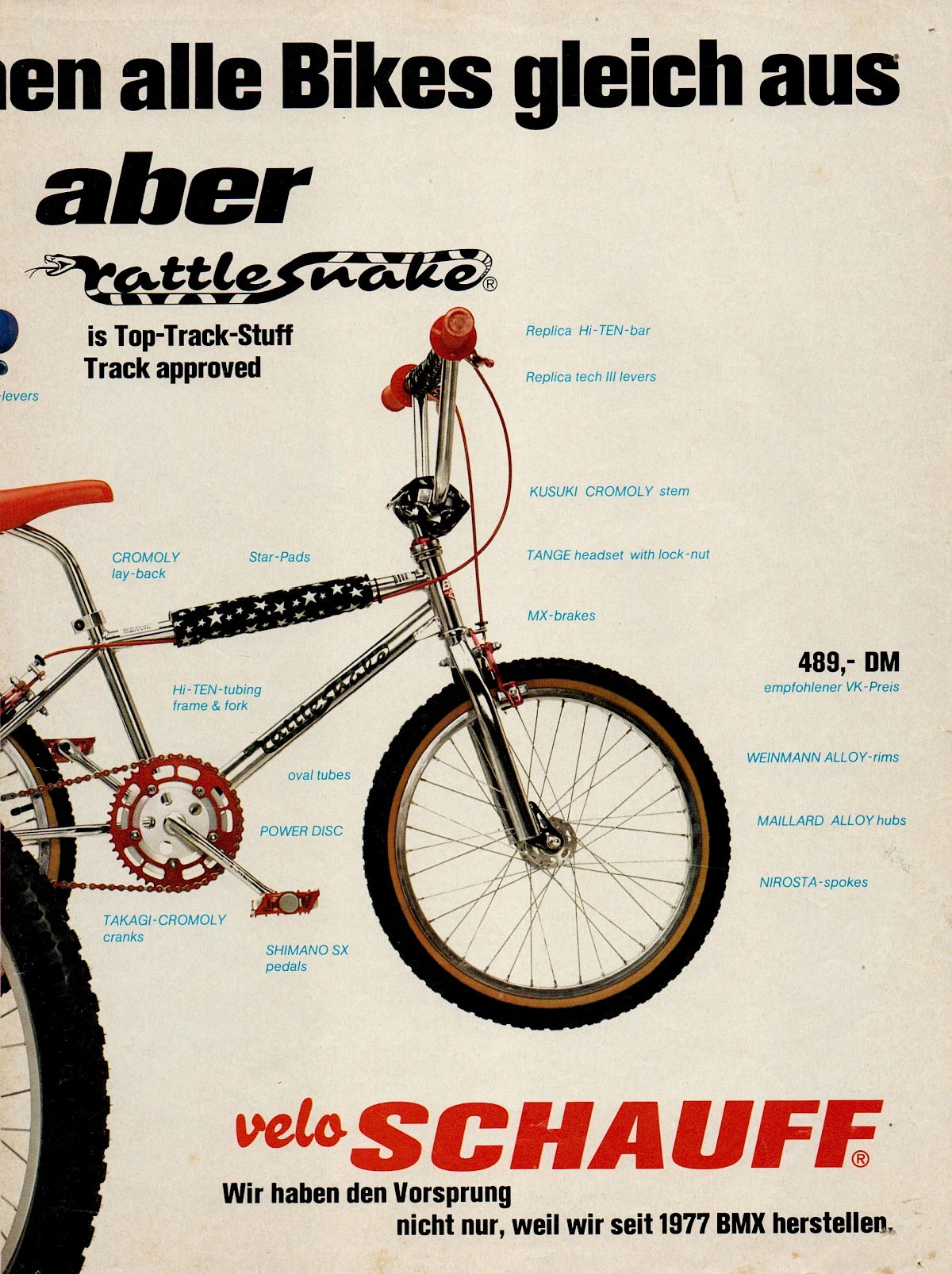 In Germany, among other places: the Cologne skate shop "Blue Diamond" was the first German customer for Schauff BMX bikes and bought 50 of them for its shop. At that time, BMX was still unheard of in Germany and so the bikes were used to make the Domplatte unsafe or to ride mud races on old tank training grounds in Cologne-Ossendorf or Porz. Schauff published his first BMX brochure with the two Cologne riders Max Victoria from Blue Diamond and Nao Tajima on the cover.