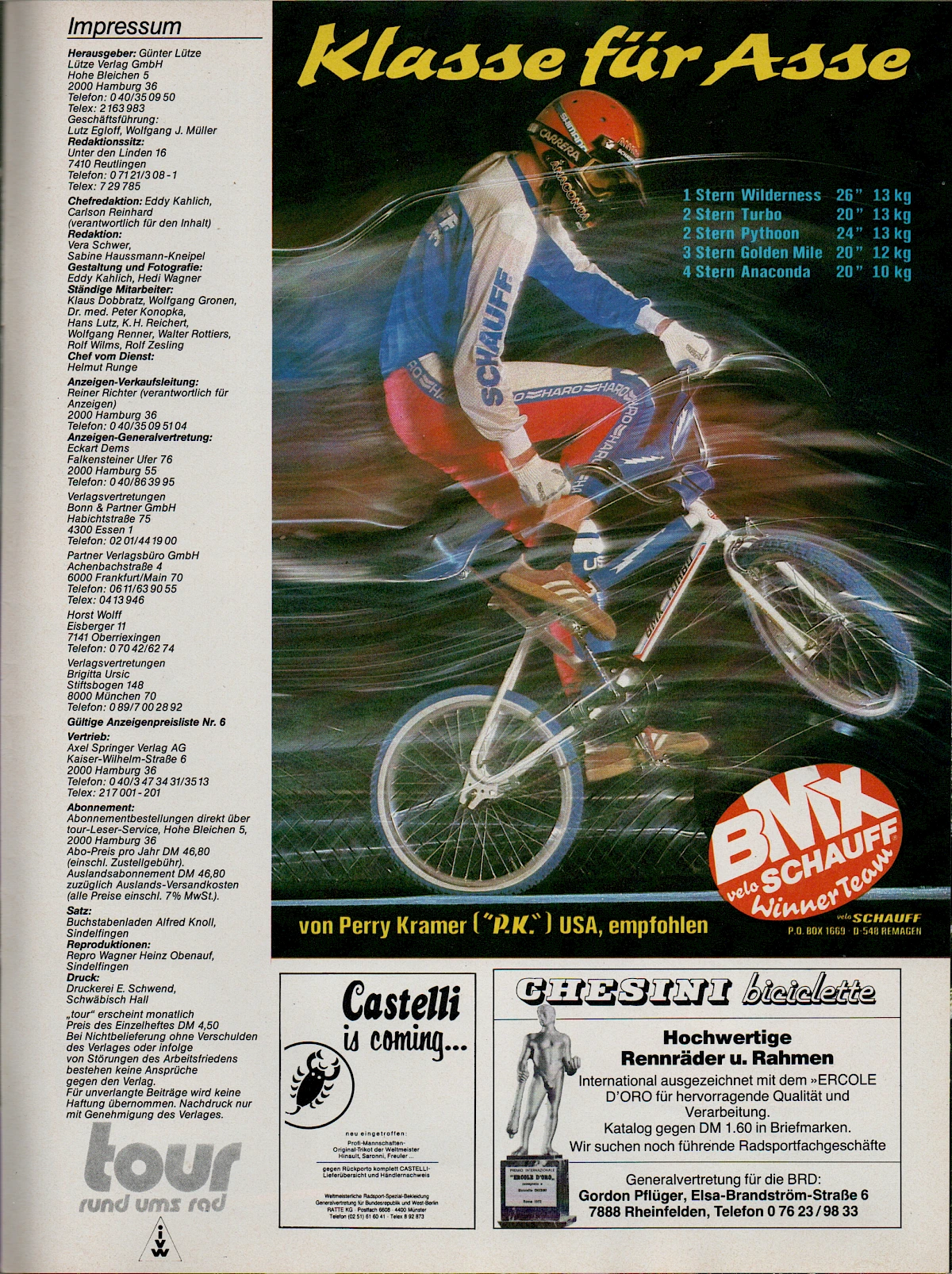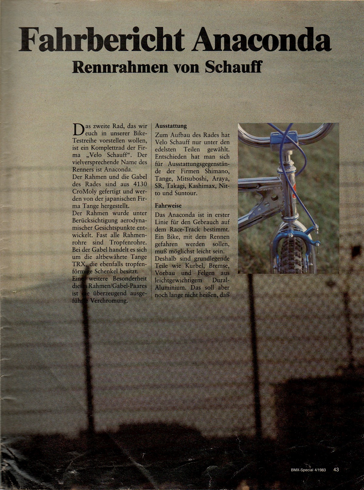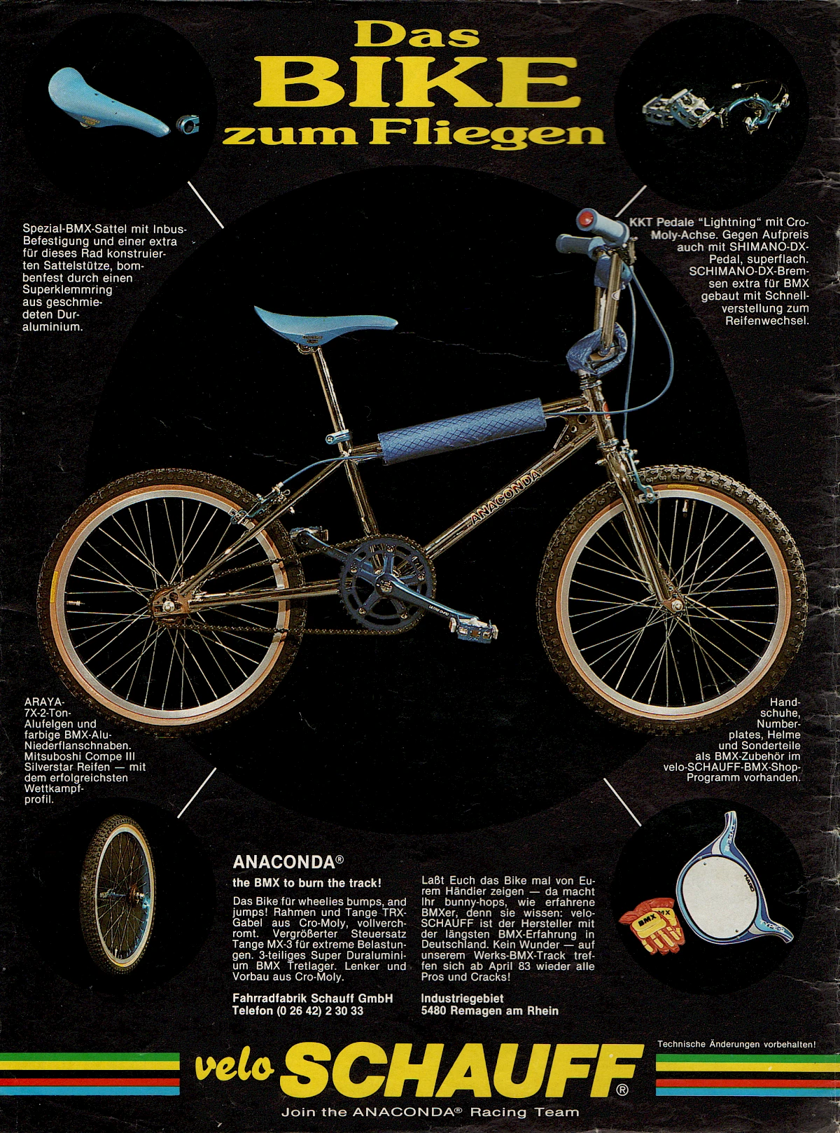 The collaboration with Perry Kramer came about because Schauff was the importer of Race Inc. where Perry worked at the time. Thanks to its close contacts in the industry, the company began importing BMX products from abroad to Germany at an early stage. Schauff's entry into the freestyle scene was also inspired by an import: After the company had launched a Haro freestyler replica under the name "Golden Mile" in 1984, the "Anaconda Freestyler" followed a year later with the double down tube familiar from Vector. Vector, a company that was otherwise only known for its somewhat idiosyncratic, one-piece handlebar/stem combinations, had also been distributed by Schauff for a long time. The "Anaconda Freestyler" turned out to be a huge success and was a fully-fledged alternative in a market dominated at the time by the "GT Performer".