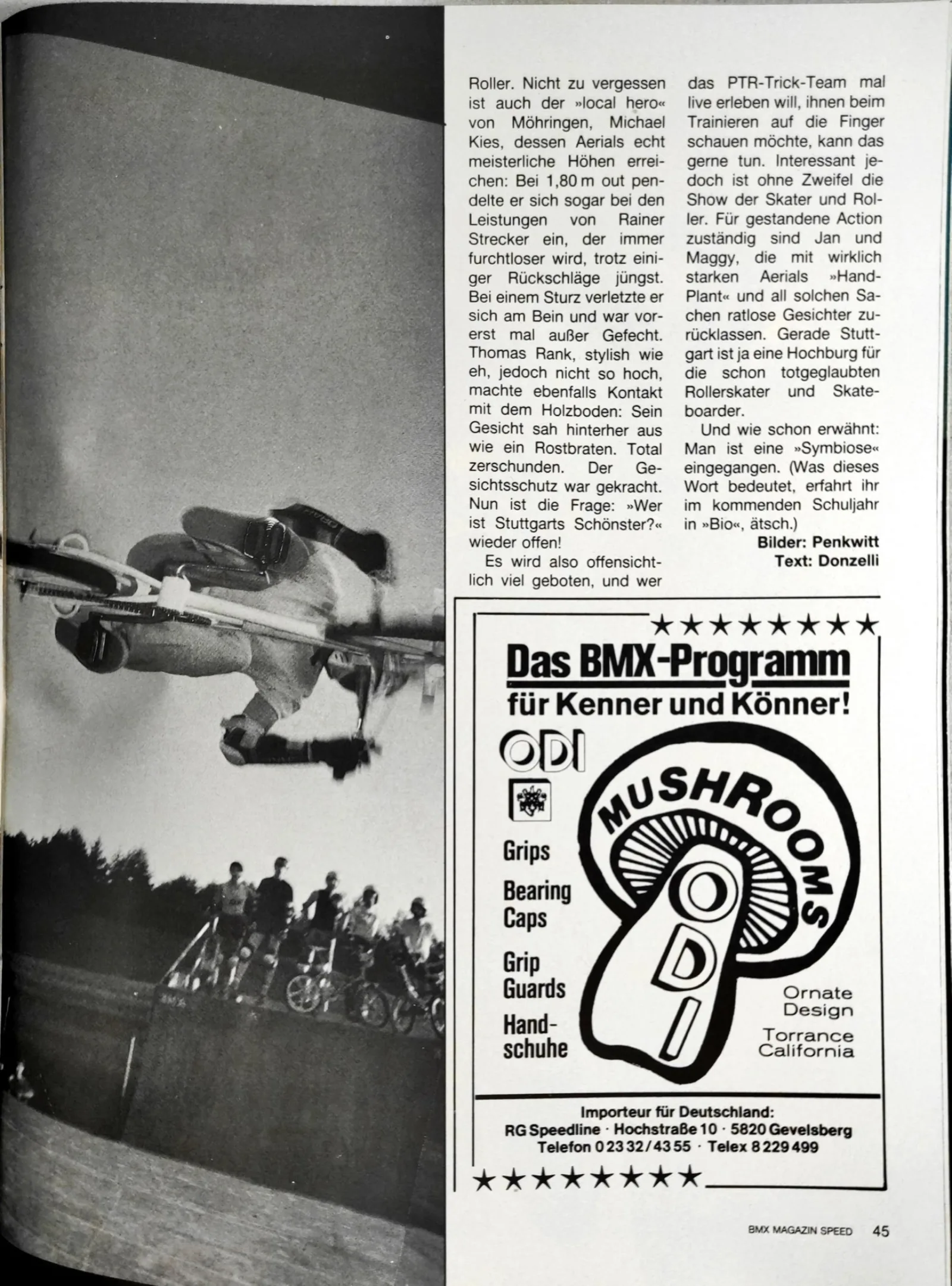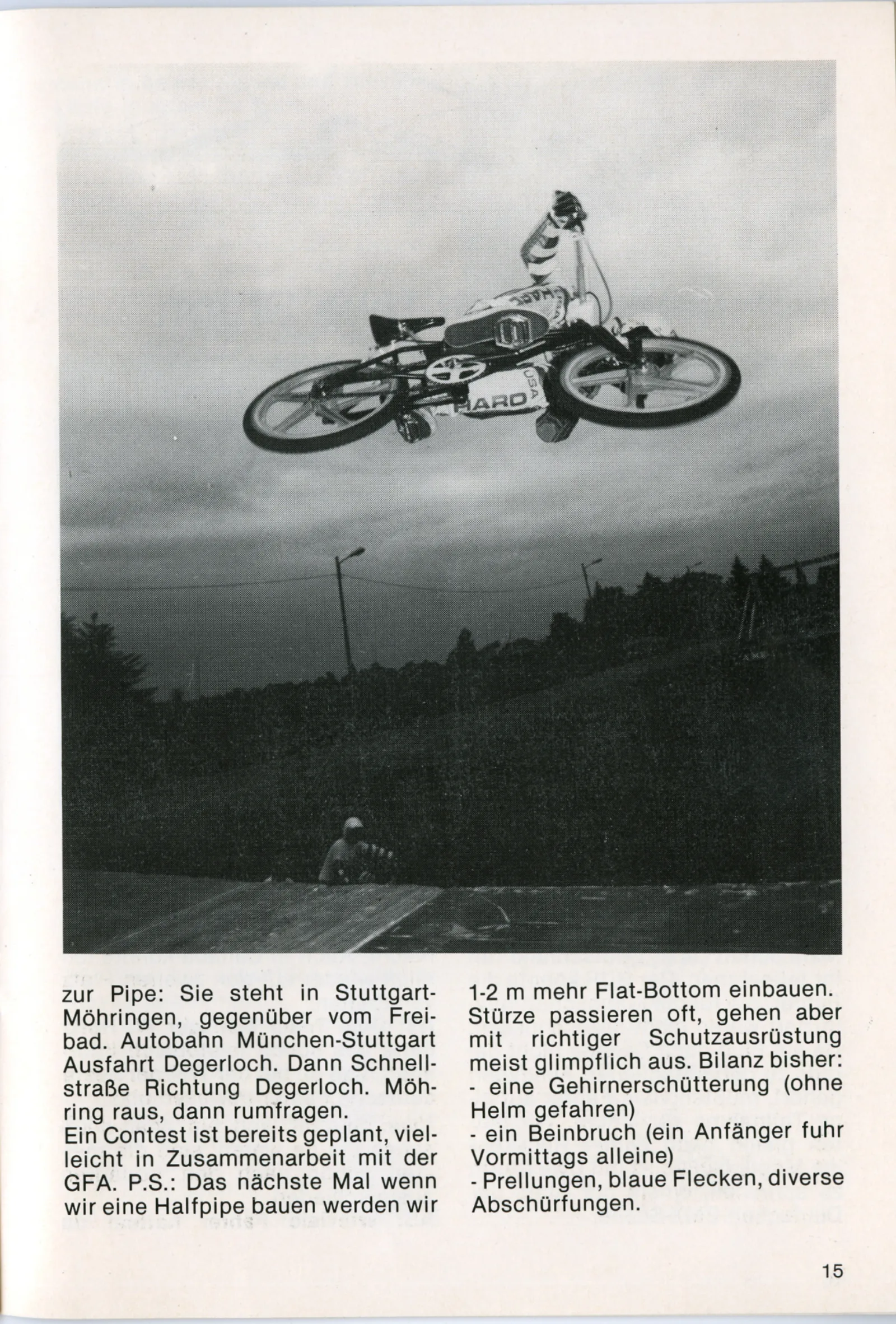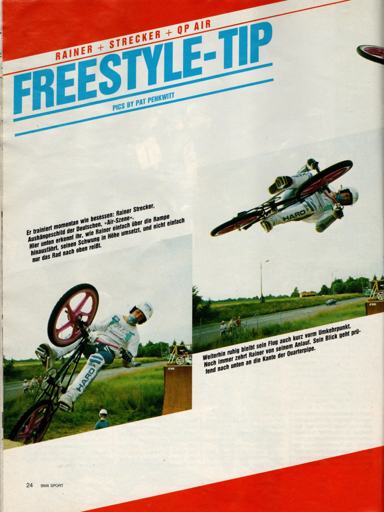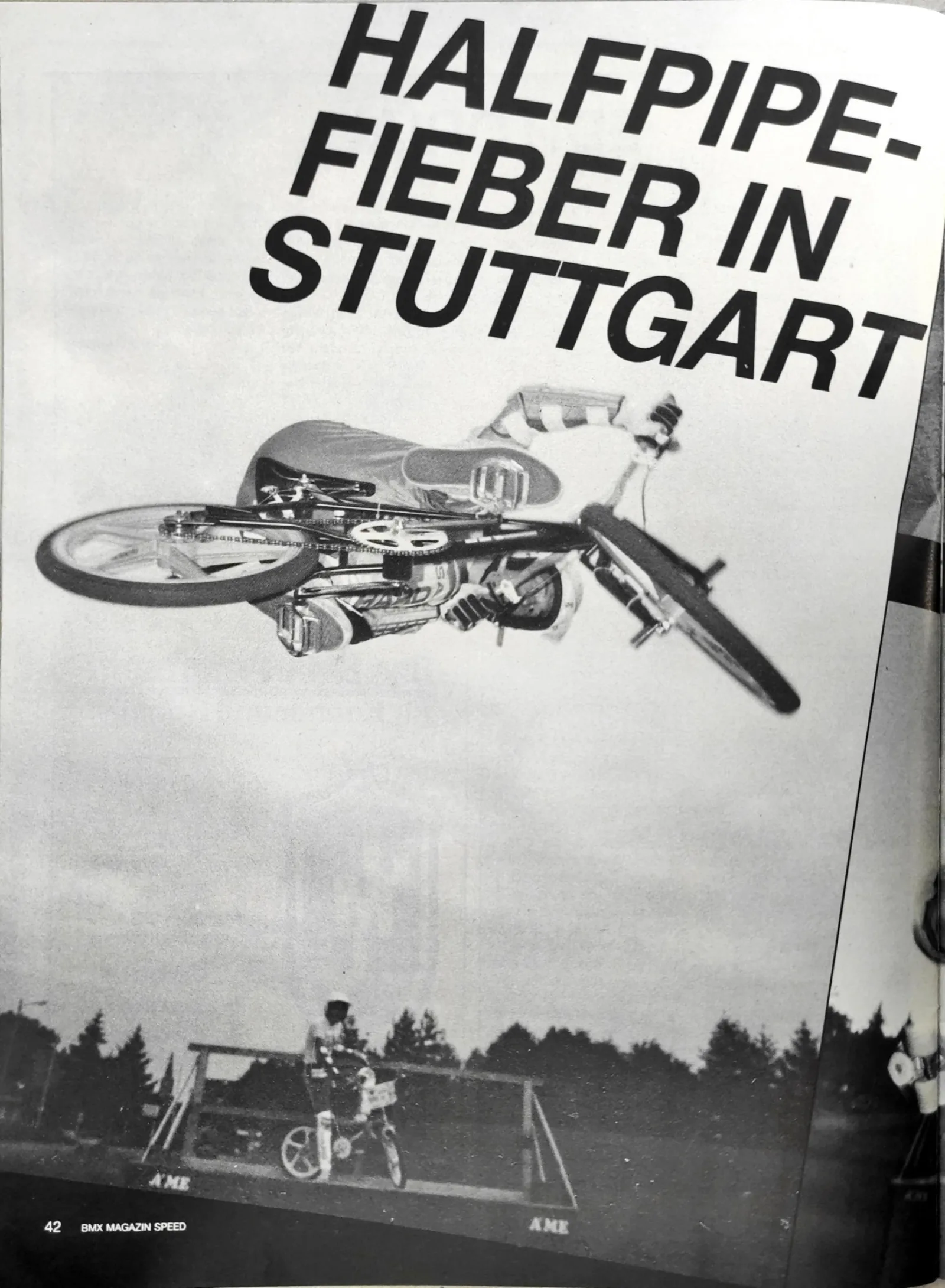 Back home, the plan for their own BMX brand took shape and PTR really took off: The three of them toured all over Germany in Patrick's parents' bus, filled the pages of "Speed" magazine and appeared on national television. Meanwhile, Rainer was looking for better training conditions at home: Around 1985, some skaters had built a half-pipe in the car park of the outdoor pool in Möhringen near Stuttgart, which consisted entirely of construction site timber apart from a few decking boards. This ramp was generously approved by an employee of the Stuttgart spa and baths authority, but when the good man visited the site for the first time about a year later and saw the dimensions of the 3 metre high ramp, the project was stopped immediately and the ramp was torn down. The famous poster from BMX Sport was also created on this ramp.