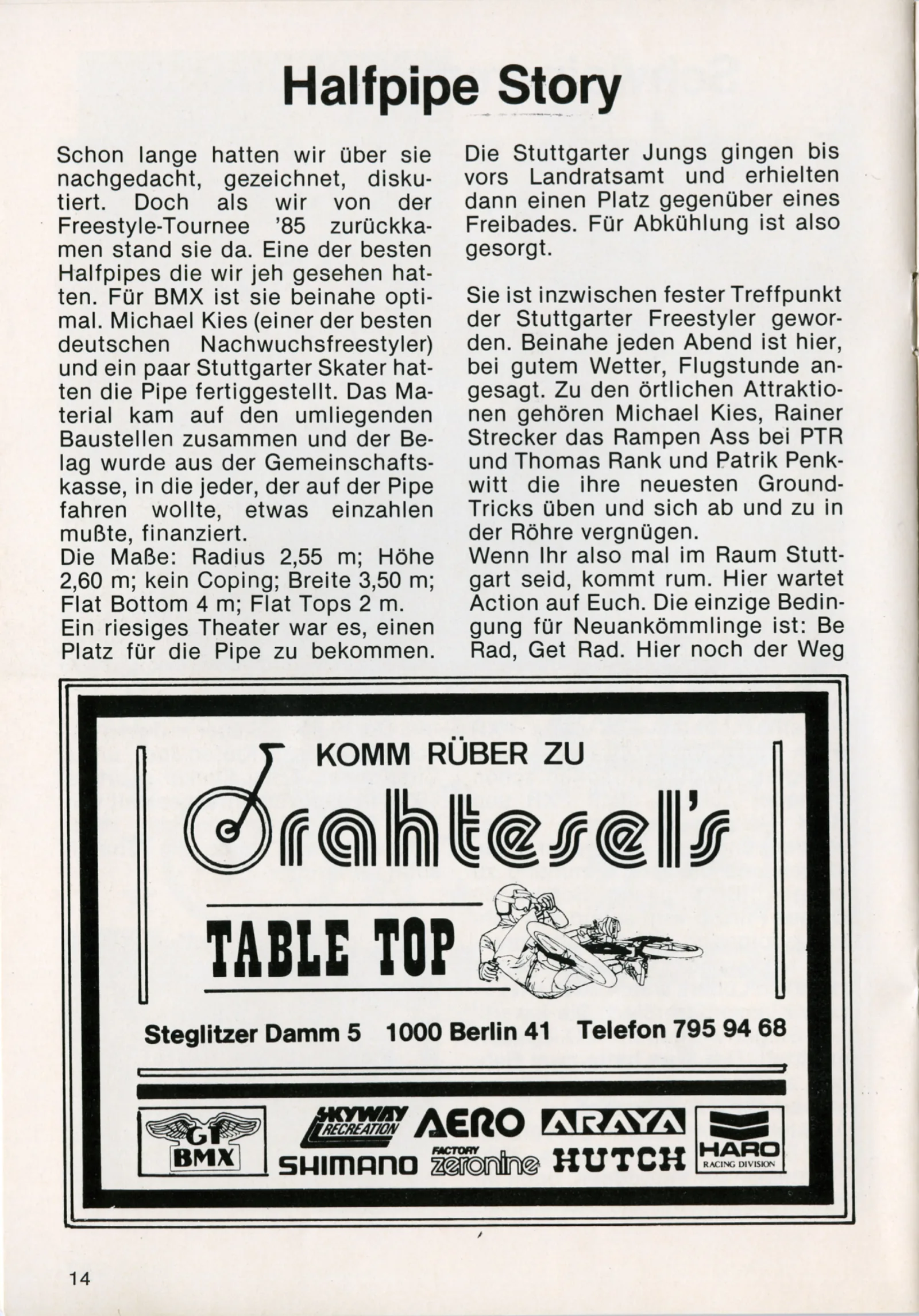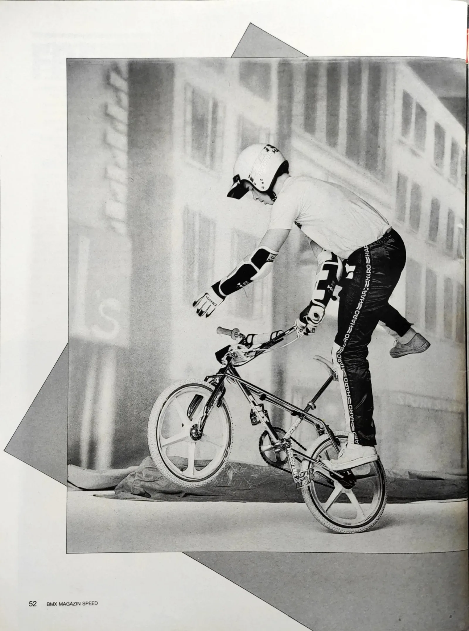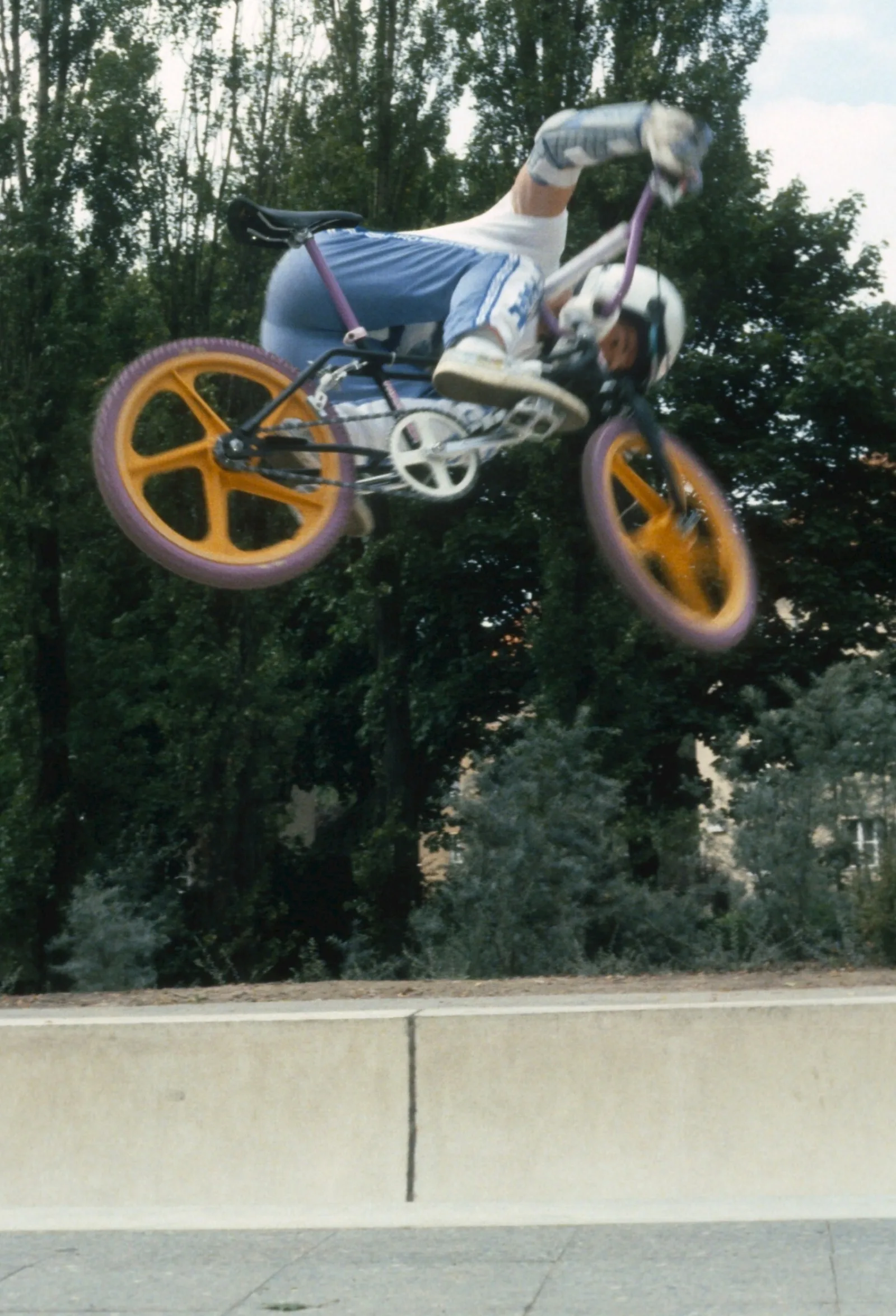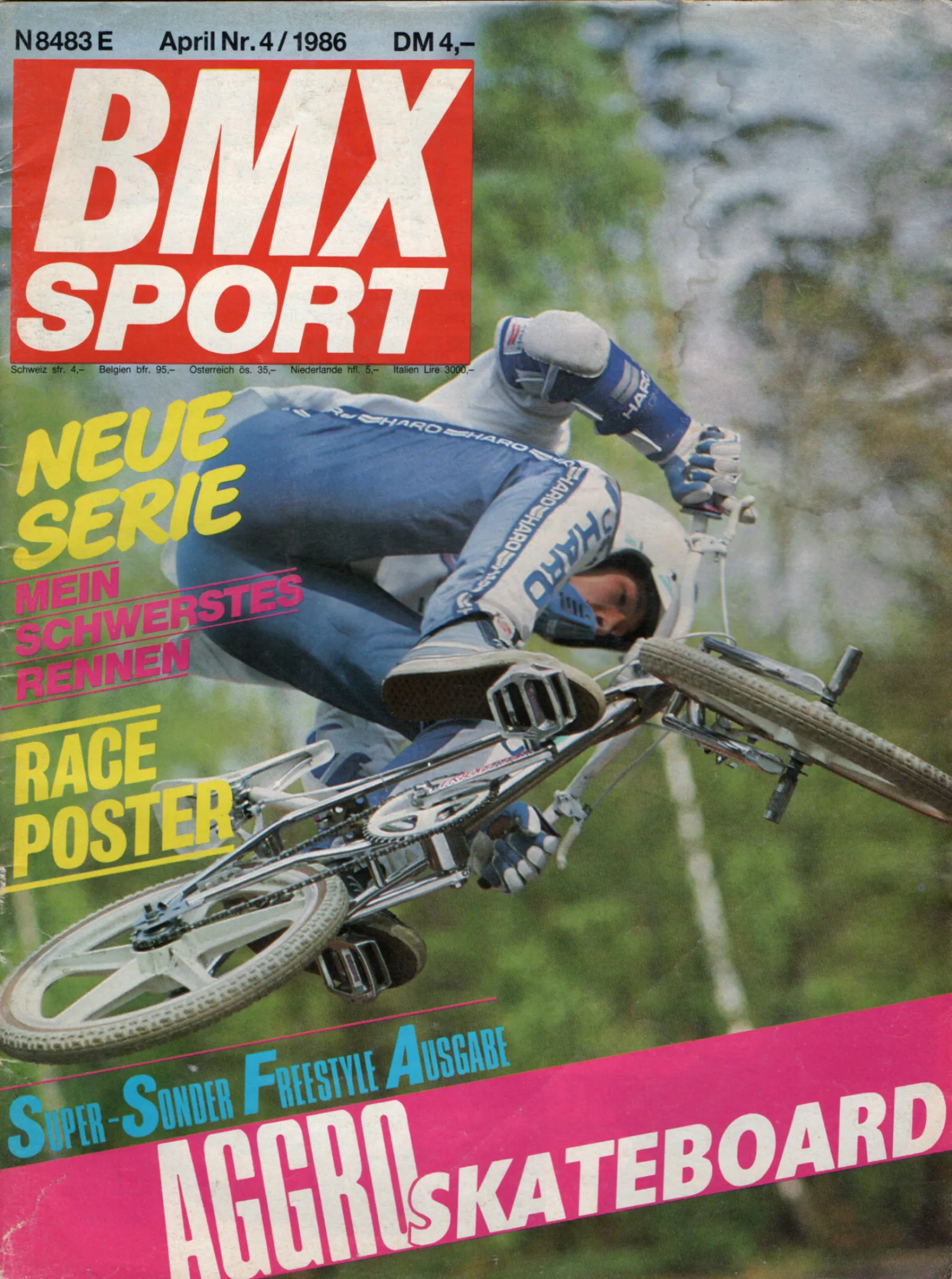 Back home, the plan for their own BMX brand took shape and PTR really took off: The three of them toured all over Germany in Patrick's parents' bus, filled the pages of "Speed" magazine and appeared on national television. Meanwhile, Rainer was looking for better training conditions at home: Around 1985, some skaters had built a half-pipe in the car park of the outdoor pool in Möhringen near Stuttgart, which consisted entirely of construction site timber apart from a few decking boards. This ramp was generously approved by an employee of the Stuttgart spa and baths authority, but when the good man visited the site for the first time about a year later and saw the dimensions of the 3 metre high ramp, the project was stopped immediately and the ramp was torn down. The famous poster from BMX Sport was also created on this ramp.