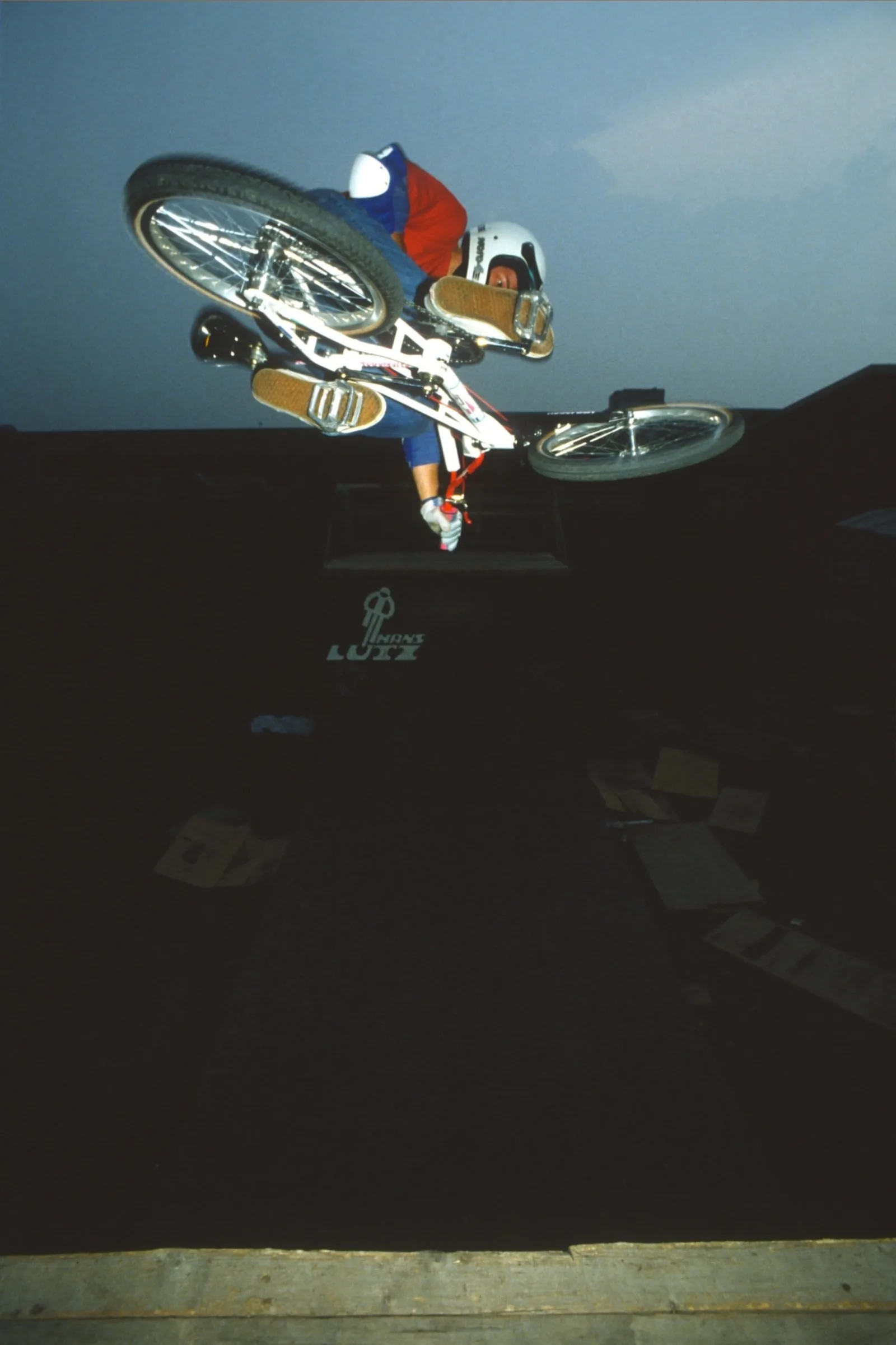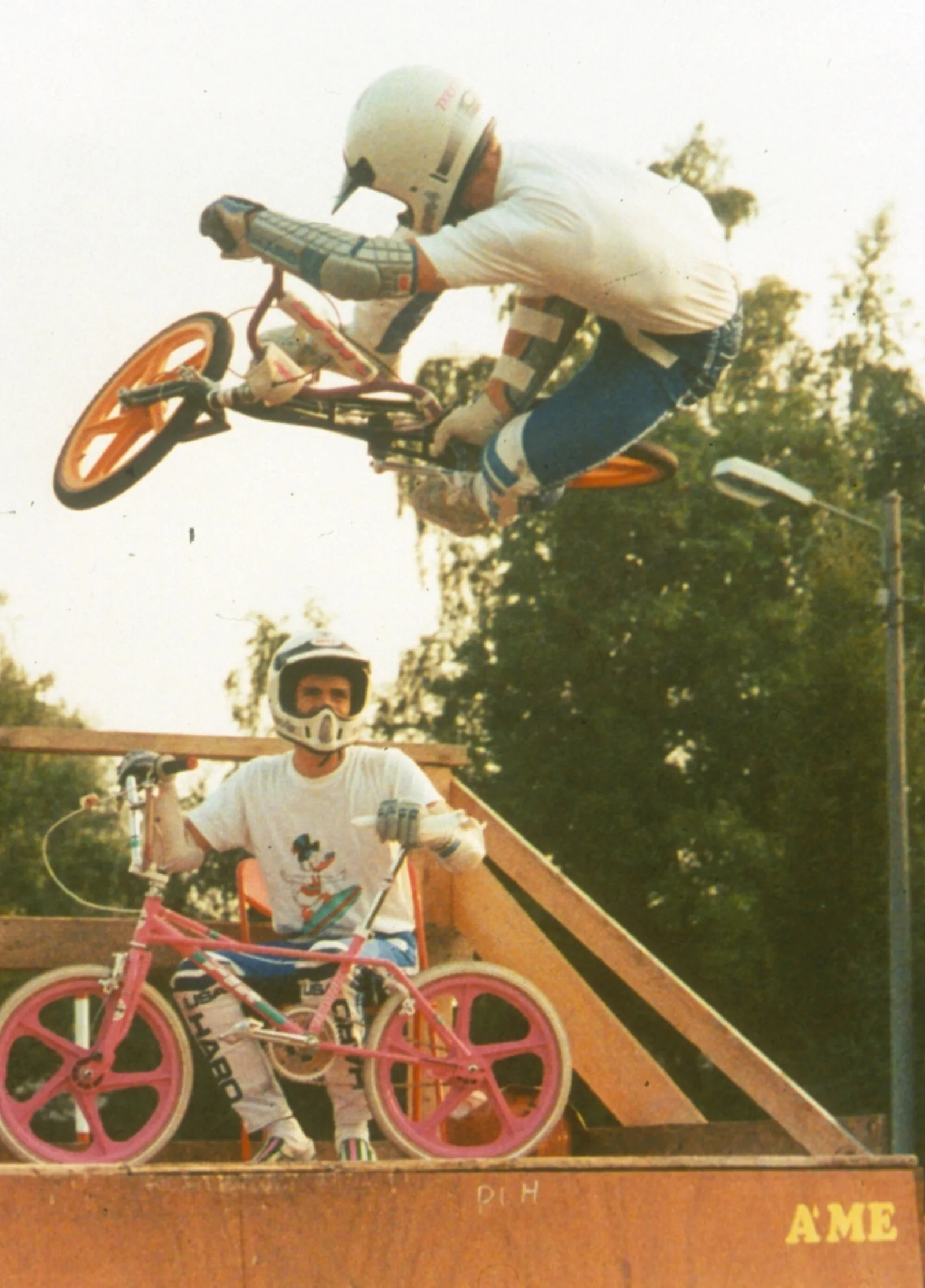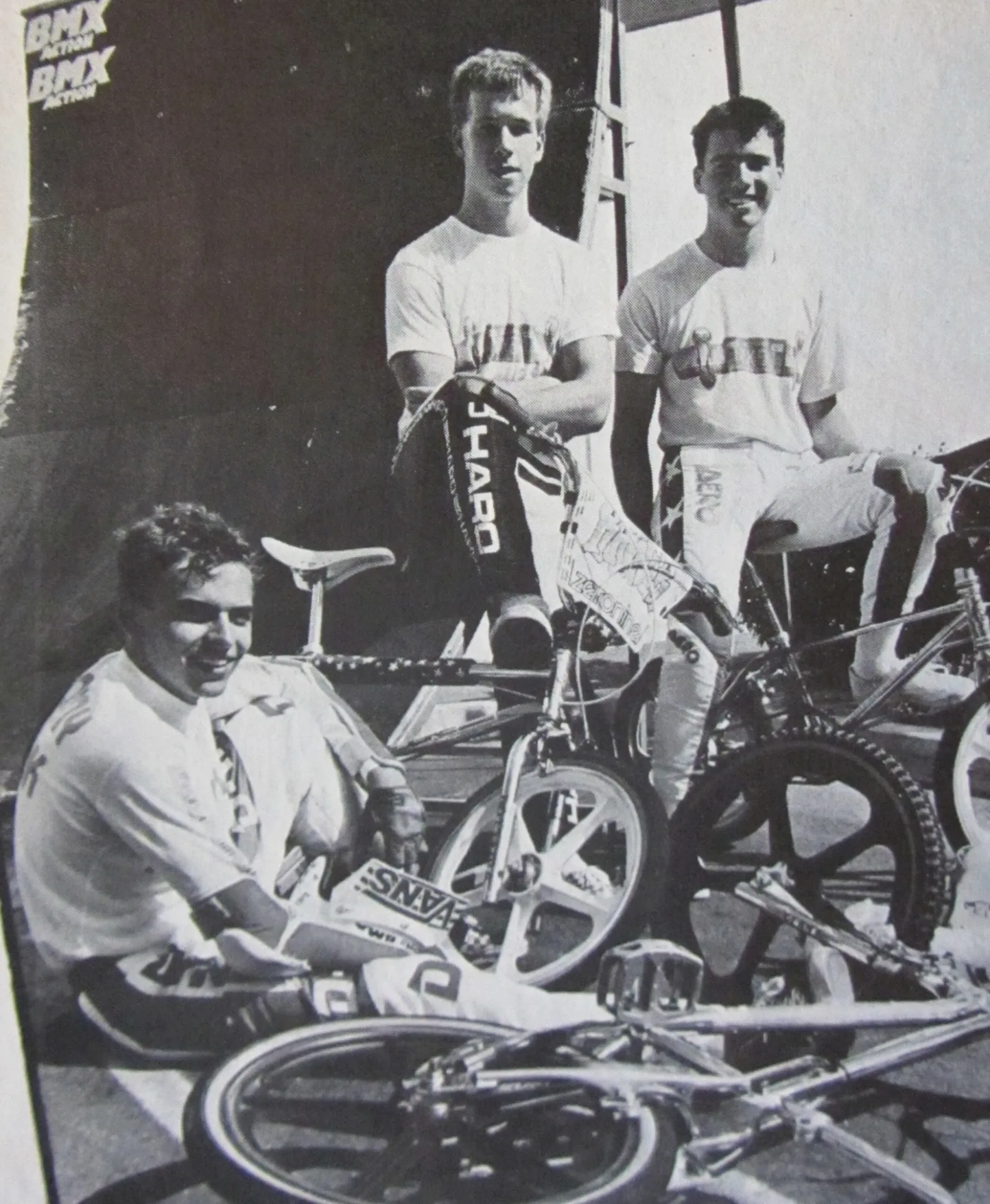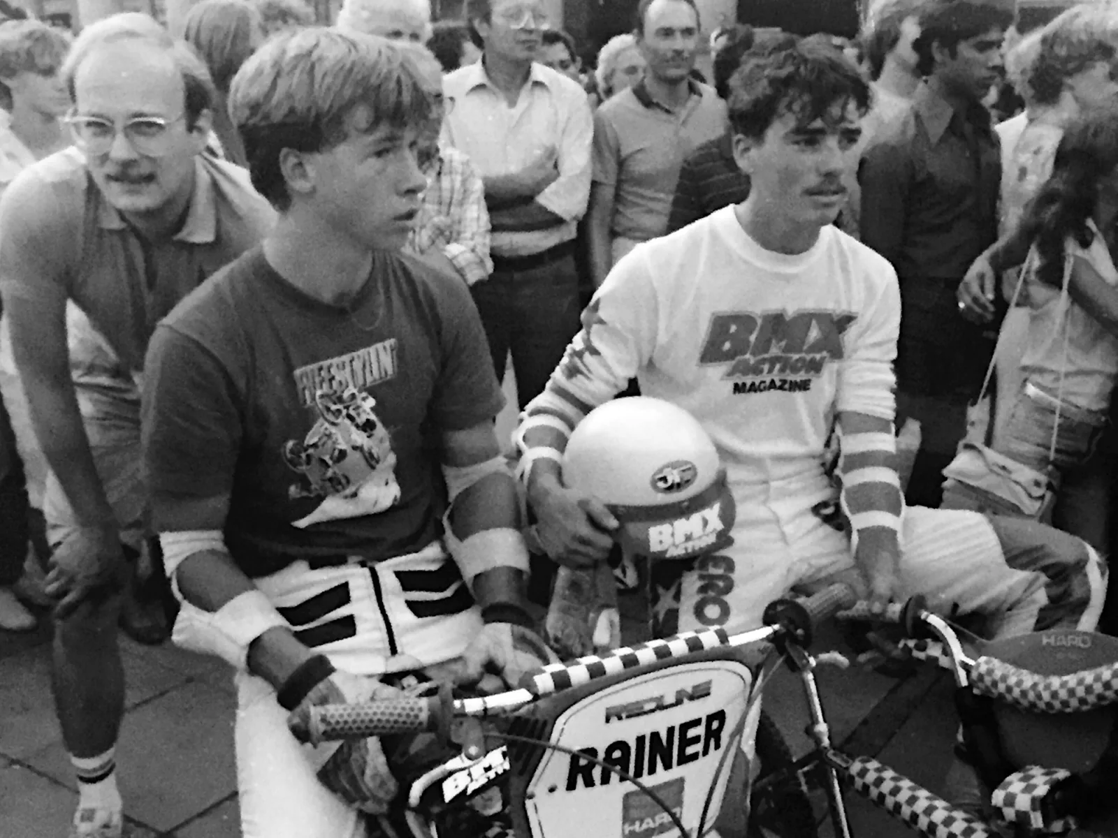 After a family holiday with Patrick's parents took the three of them to the Pipeline Skatepark in Upland, the fire was finally lit: Rainer rode the merciless holes of the famous skatepark and the ramp in the backyard of Wizard Publishing, where the venerable BMX Action magazine was born. They met Tony Murray and Eddie Fiola and rode a show for Bob Haro, who sponsored them directly.