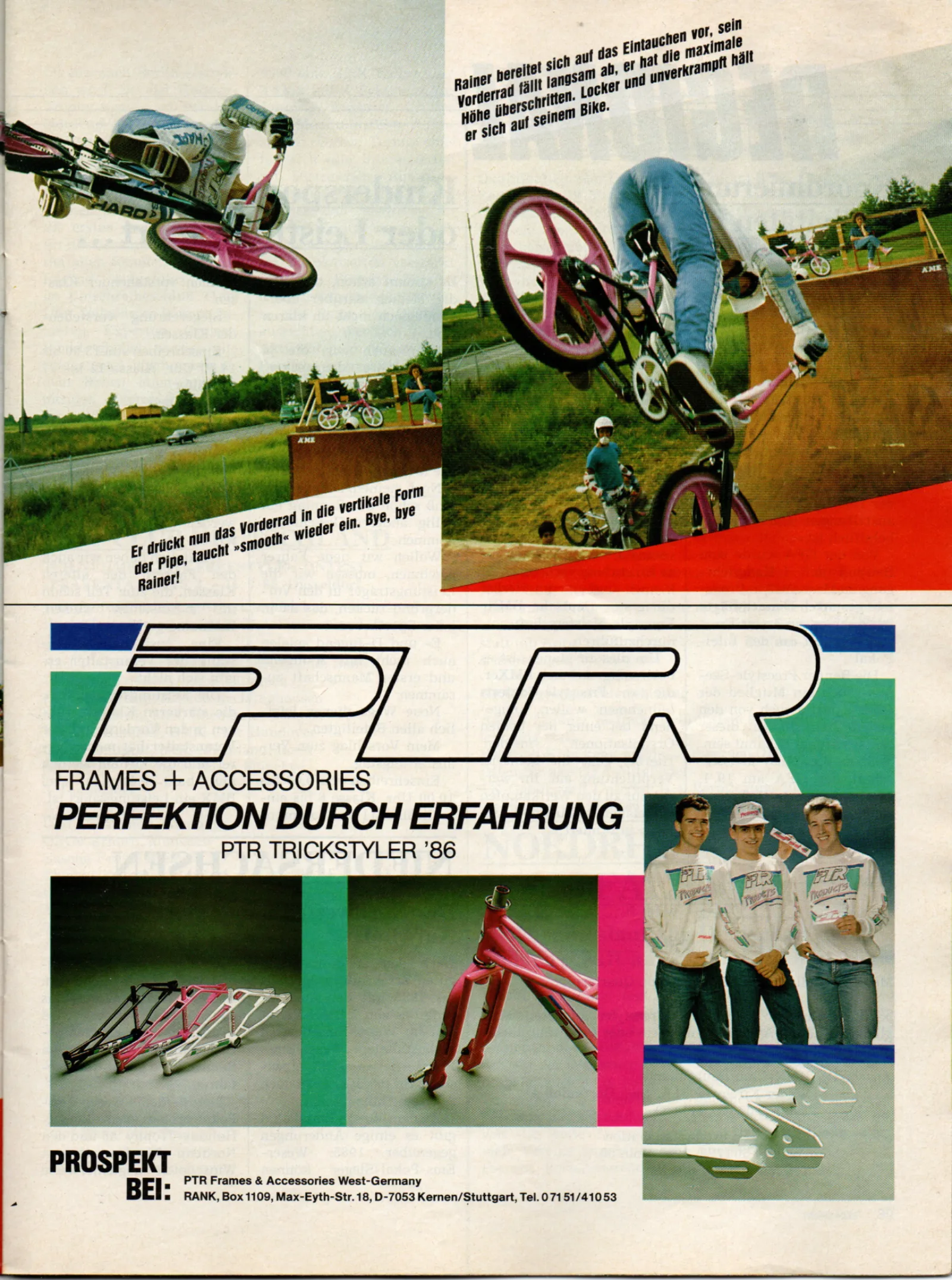 After Patrick, Thomas and Rainer jointly decided to end the PTR trick team in 1986 and discontinue frame production, Rainer rode for Haro for a while longer, faced the competition in Cologne's Jugendpark in 1987 and used another trip to the USA to tick Ron Wilkerson's "Enchanted Ramp" off the ultimate BMX bucket list of the mid-80s after Upland and the legendary "T.O.L." halfpipe, which he visited on the team's second trip to the USA. Towards the end of 1987, however, he also ended his career and the "PTR" chapter was finally history.
