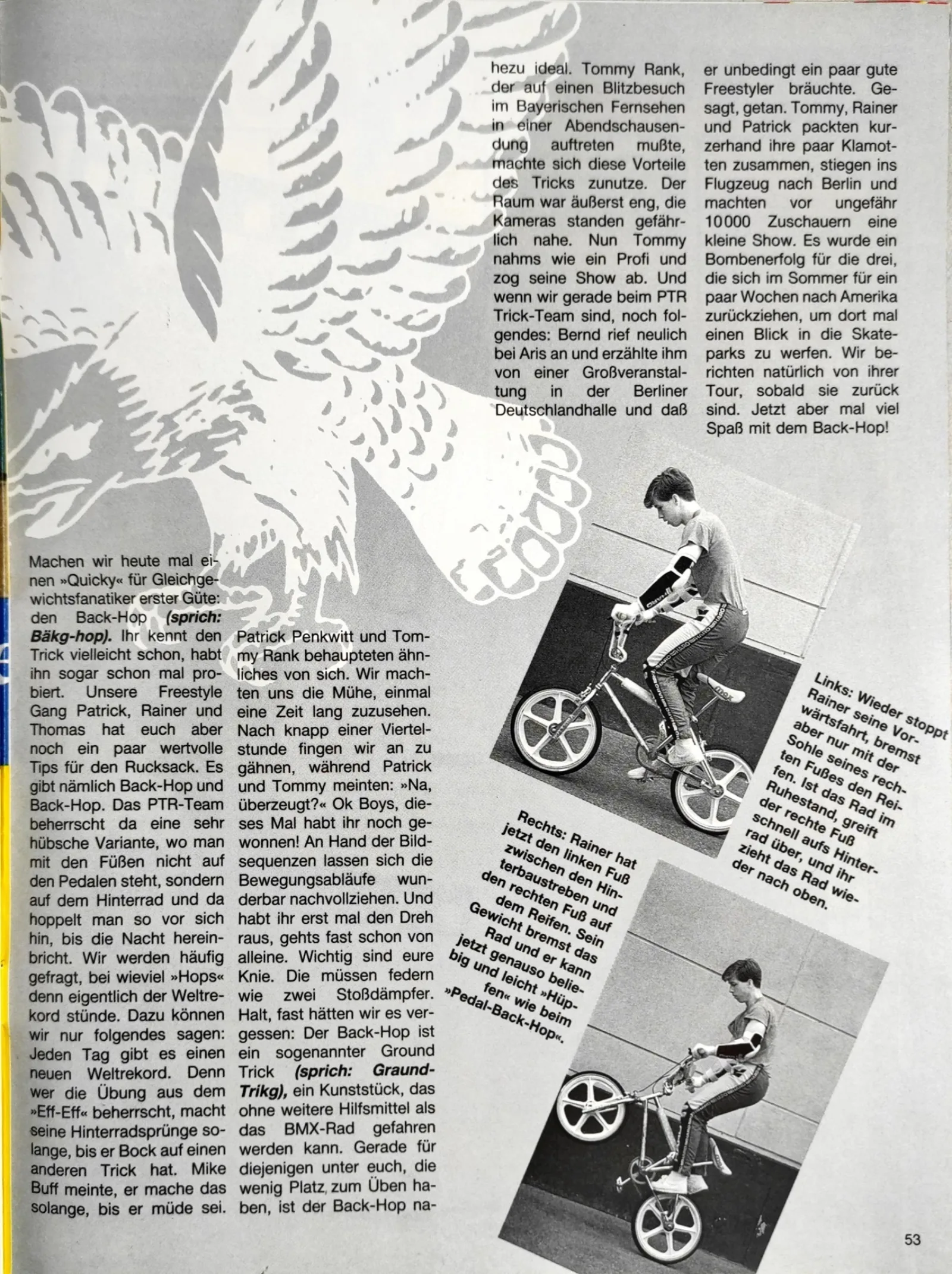 But he took a liking to the jumps and the height and swapped the St. Tropez for a brand new Redline Proline. Together with his mate Matthias Schönleber, Rainer visited the BMX tracks in the area and the two of them built ramps out of formwork boards. When the BMX Action magazine published the famous plans for the construction of a quarter pipe at the end of 1983, there was no question: the 1.88 m high piece of jewellery was immediately built and placed on a turning hammer in Degerloch near Stuttgart - the home of Rainer and Patrick Penkwitt. Rainer had got to know Patrick some time earlier when he also rode through the town on a Redline with flowing hair and an off-the-shoulder T-shirt. Patrick's schoolmate Thomas Rank soon joined them and so the PTR trick team was formed.