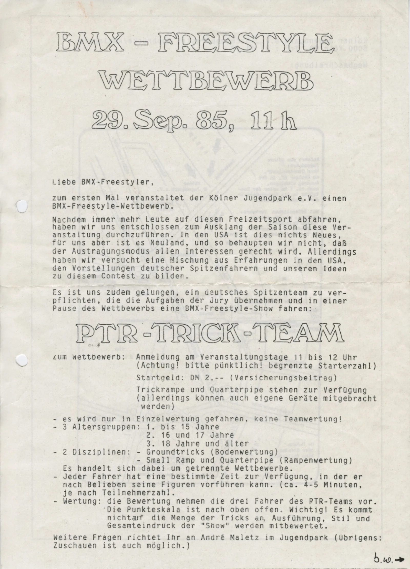 Aber Racing war auch nicht wirklich das Hauptinteresse der Jugendlichen. Sie wollten Freestyle fahren und so wurde als nächster Schritt die berühmte 1,88 m hohe BMX Action-Quarterpipe nachgebaut und mit den Vorbereitungen für das nächste Event begonnen. Der Freestyle-Sport verbreitete sich langsam in ganz Deutschland, Showteams in Bonn, Bremen und Düsseldorf und nicht zuletzt das PTR-Trickteam aus dem Stuttgarter Raum machten sich einen Namen. Peter Beu wandte sich an einen anderen Mitarbeiter des Kölner Jugendparks, der zur gleichen Zeit Musikworkshops gab: André Maletz. Gemeinsam organisierten sie 1985 den ersten großen BMX Freestyle Contest in Deutschland: Sie luden das PTR-Team als Judges und Showacts ein, baten befreundete Teams, ihre Rampen mitzubringen und veranstalteten einen lockeren Wettbewerb mit offener Atmosphäre und möglichst wenigen Regeln. Inzwischen hatten sich viele ehemalige BMX-Racer dem Freestyle zugewandt und das lockere Format im Jugendpark sorgte für eine ausgelassene Stimmung und machte gleichzeitig deutlich, dass auch in Deutschland auf hohem Niveau Freestyle gefahren wird.